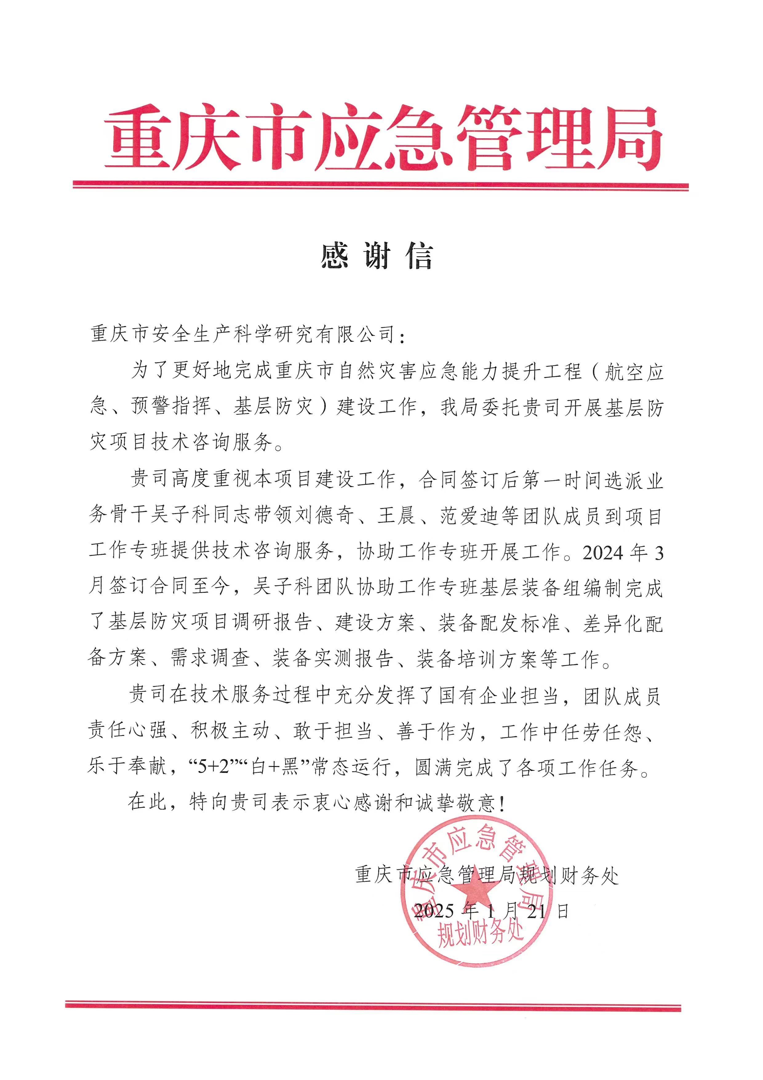 重慶市應(yīng)急管理局就國債項(xiàng)目技術(shù)支撐服務(wù)工作向公司致